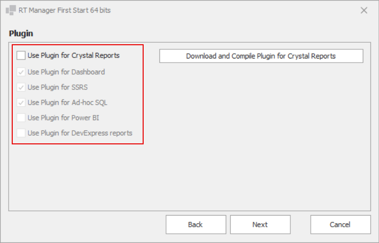RTRM is a plugin-based system, which allow it to work with various report types. Some plugins are pre-installed, some require download and compilation. The list of the available and optional plugins is on the left. Most plugins are ready to use. If you want to use Crystal reports plugin you need to check the checkbox on the left. You will be asked if you would like to download and compile the plugin.