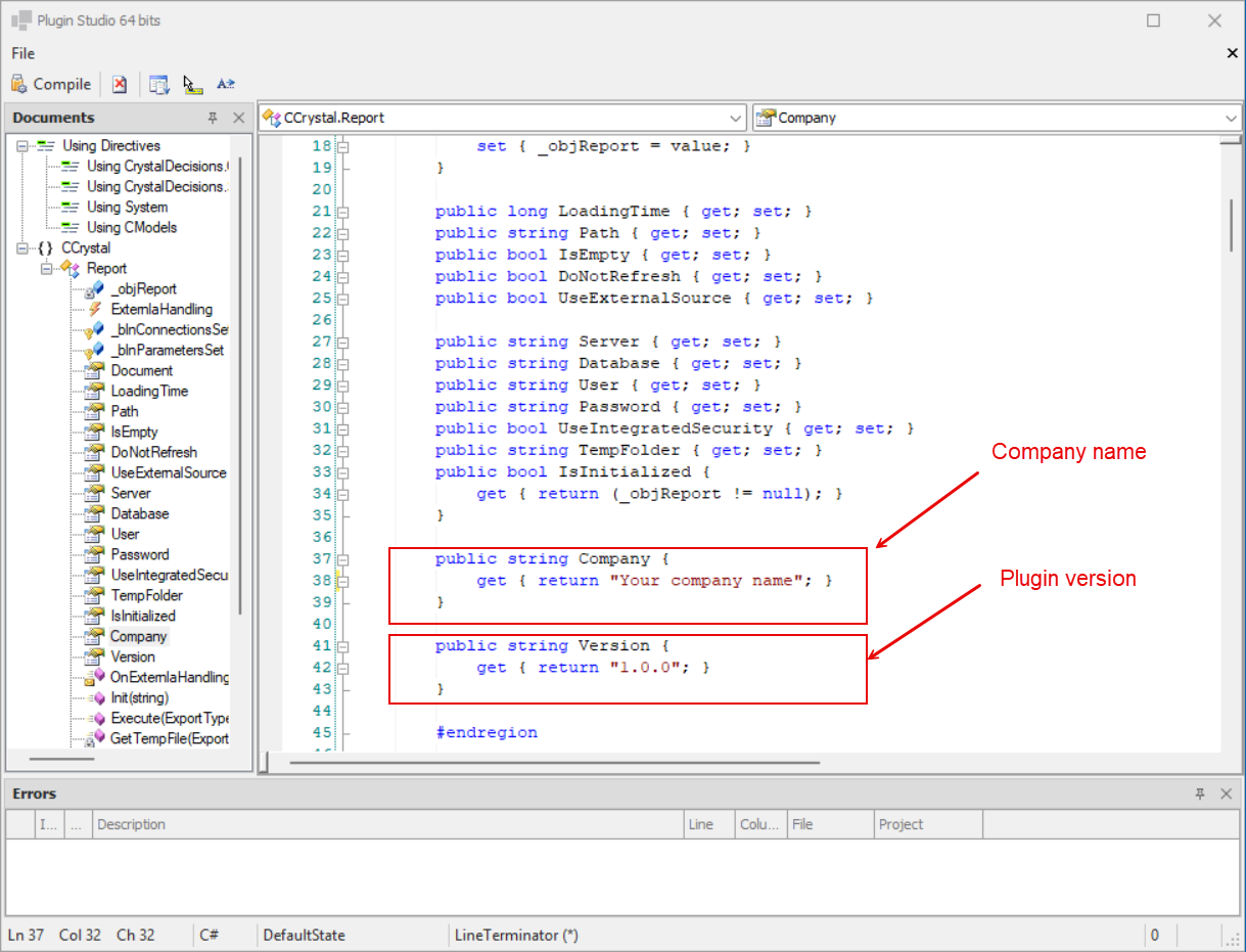 If you answer yes, the wizard will open Plugin Studio, where you can compile the plugin. You can review the code and make changes if necessary. Please, set your company name and version. RTRM is using these values to identify the plugin and associated licenses.