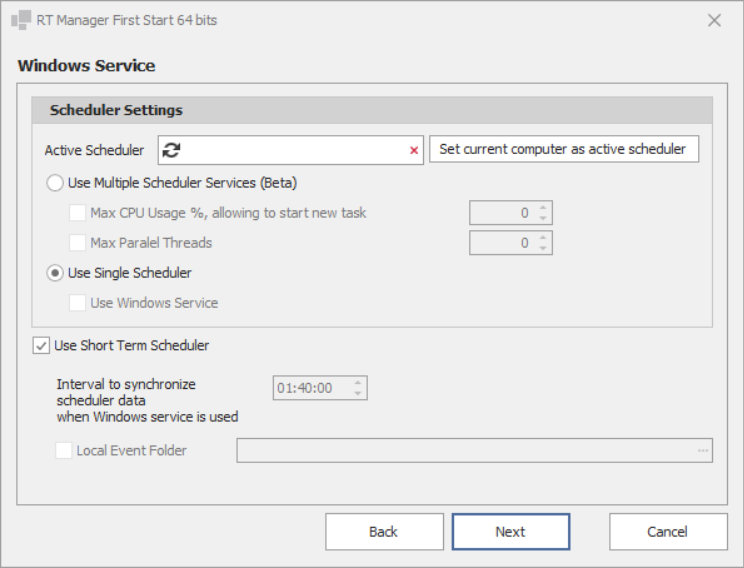 RTRM scheduler is using a windows service. Since the service might be installed on multiple computers, you need to tell RTRM which computer will be an active scheduler. Use button "Set current computer as active scheduler". This will prevent firing schedule events on multiple computers and generating multiple files and emails. As of January 2025, the preferable method is to use Single Scheduler. Option to use Multiple Schedulers is in Beta and should not be used except you have support plan which includes Beta features. Please check the check box "Use Windows Service" and you will be asked for user name and password , which will be used to run the Windows service. You can use System account or a user account created by your Admin.
