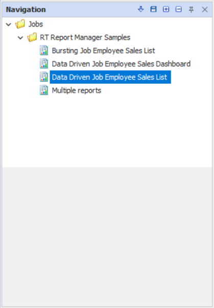 RTRM provides a few samples to demonstrate different technique to run reports and jobs. For example, there is Dashboard report, fully created in the internal Dashboard editor and sample jobs for Crystal reports bursting and Data driven reports.